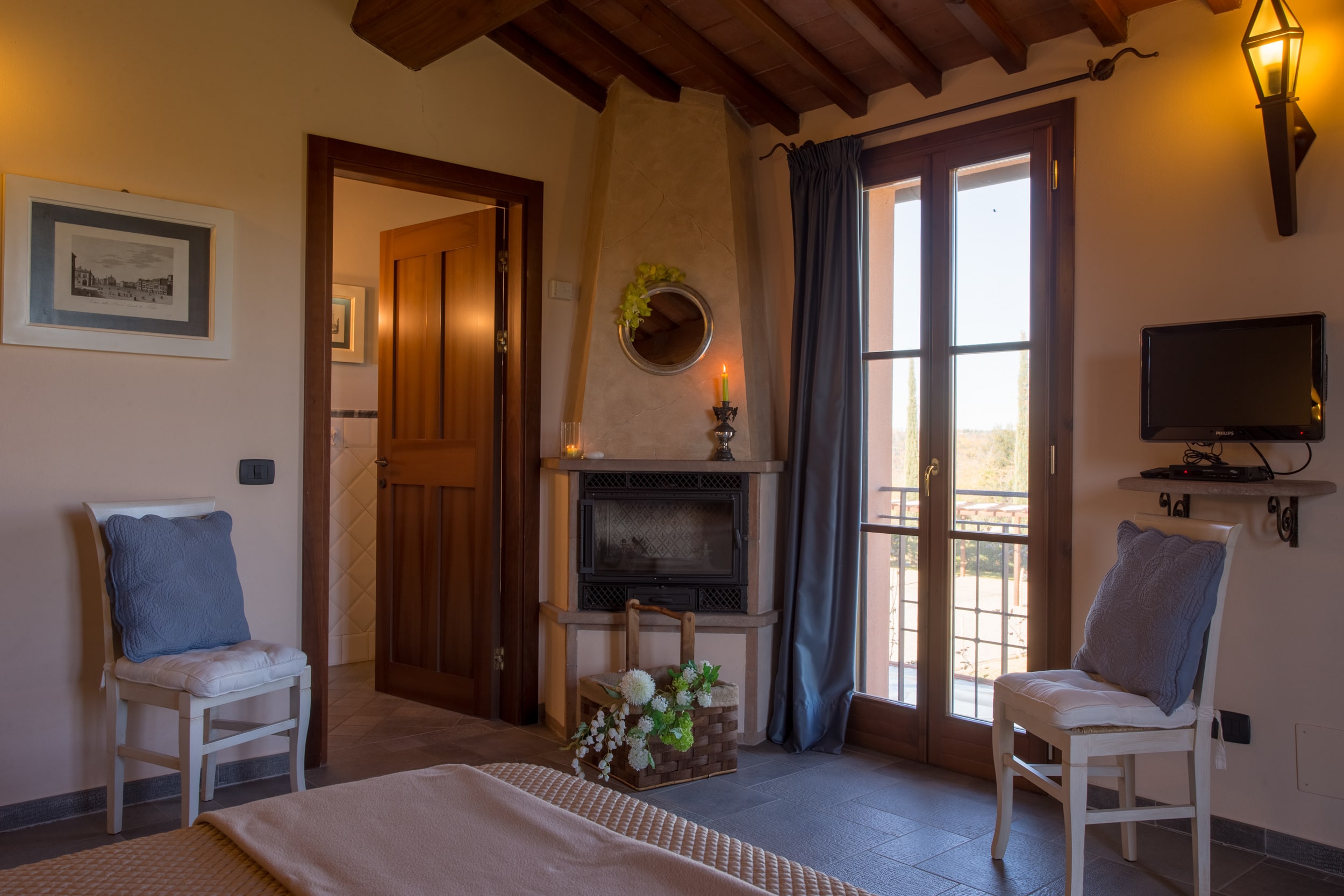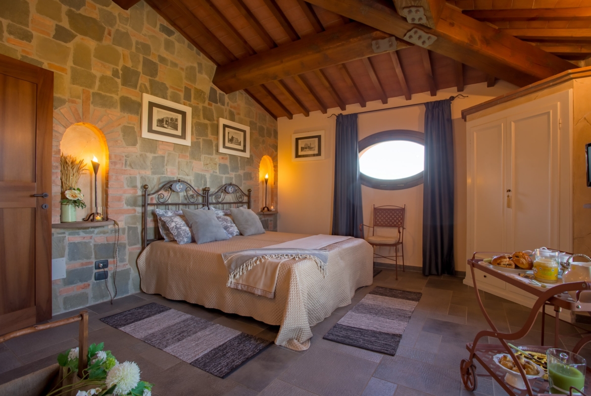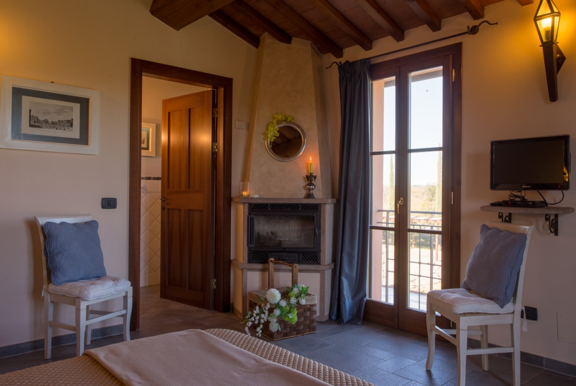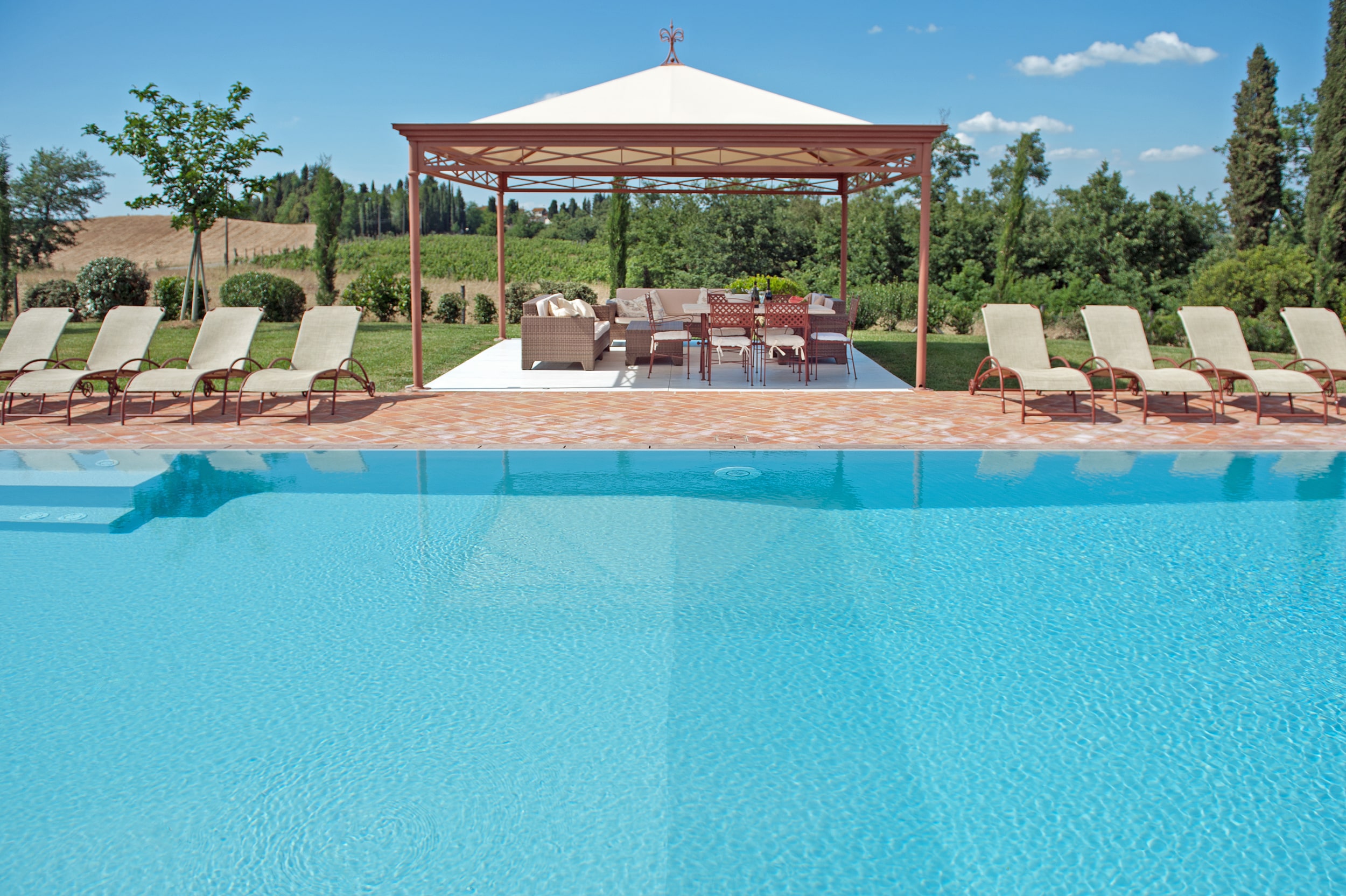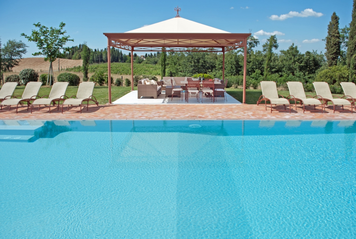 • FIRST FLOOR A wrought iron and stone staircase leads to the first floor consisting of 2 double bedrooms (convertible into triples), a double bedroom (with the possibility of adding a single bed), each with its own bathroom with shower, rustic fireplace and Satellite TV and finally a closet; a spiral staircase leads to the “dovecote”, a typical turret placed in the center of the roof, transformed into a room with armchairs from which you can enjoy a 360 ° panoramic view of the hills. Returning to the ground floor, the kitchen and living room open out onto a wrought iron pergola, where you can have meals or simply relax on comfortable sofas. The whole villa is also equipped with a floor heating and air conditioning system, independently adjustable from each room, piped music, alarm, safe and telephone and a convenient covered parking for cars. A few meters from the villa there is everything you need to fully enjoy your holidays. A small rustic-style annex, open on 3 sides and equipped for cooking, having a barbecue or relaxing, a 15 m swimming pool. x 5 m. deep from 150 to 40 cm. with Roman staircase entrance, lumbar and cervical hydromassage area controlled by pneumatic buttons, on the overflow edge on 3 sides, while on the remaining side a small waterfall overlooks the part of the pool dedicated to children, where the water is only 40 cm high; a solarium with sunbeds, chairs and small tables for sun lovers; a wrought iron gazebo with sofas and armchairs for those who prefer shade.
