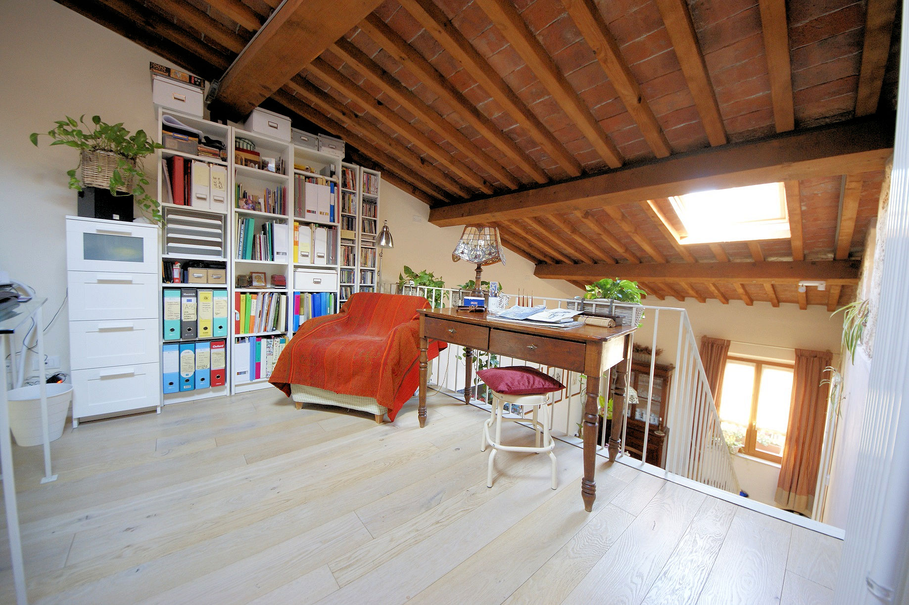 Terracotta floors in the living area and wood floor upstairs.