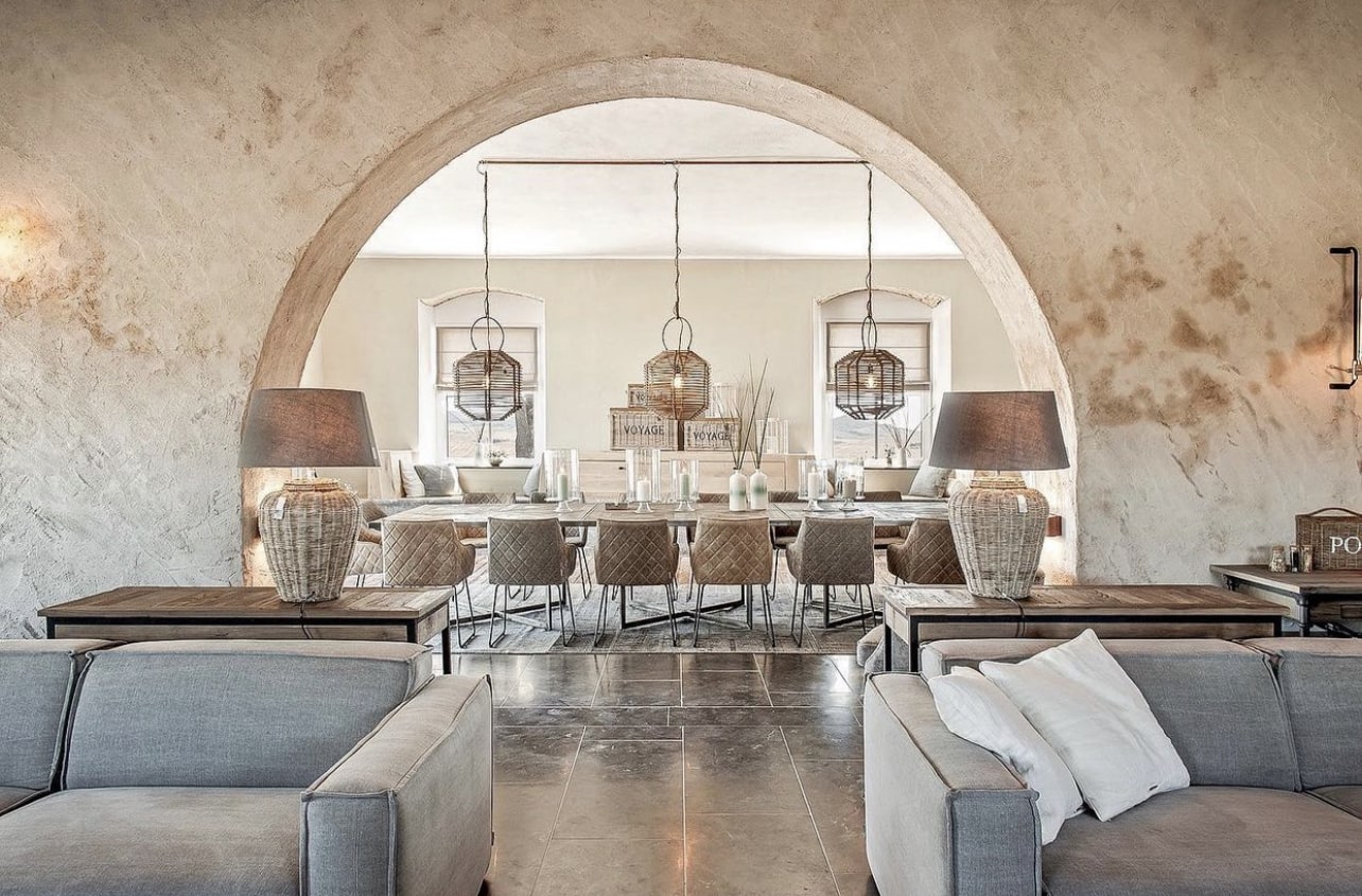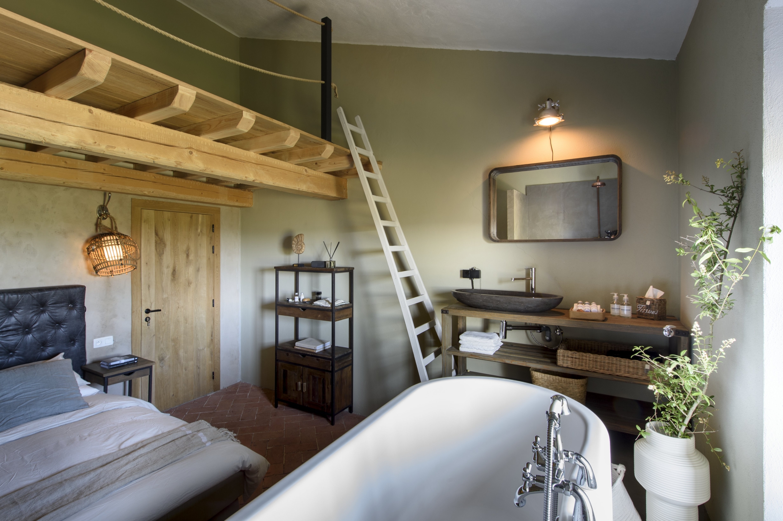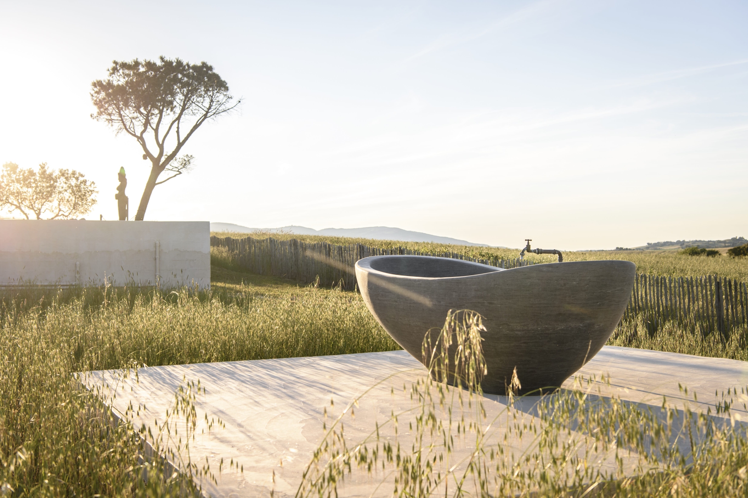 Various lounging spaces around the house including an outside bath.