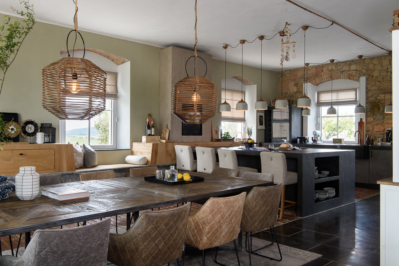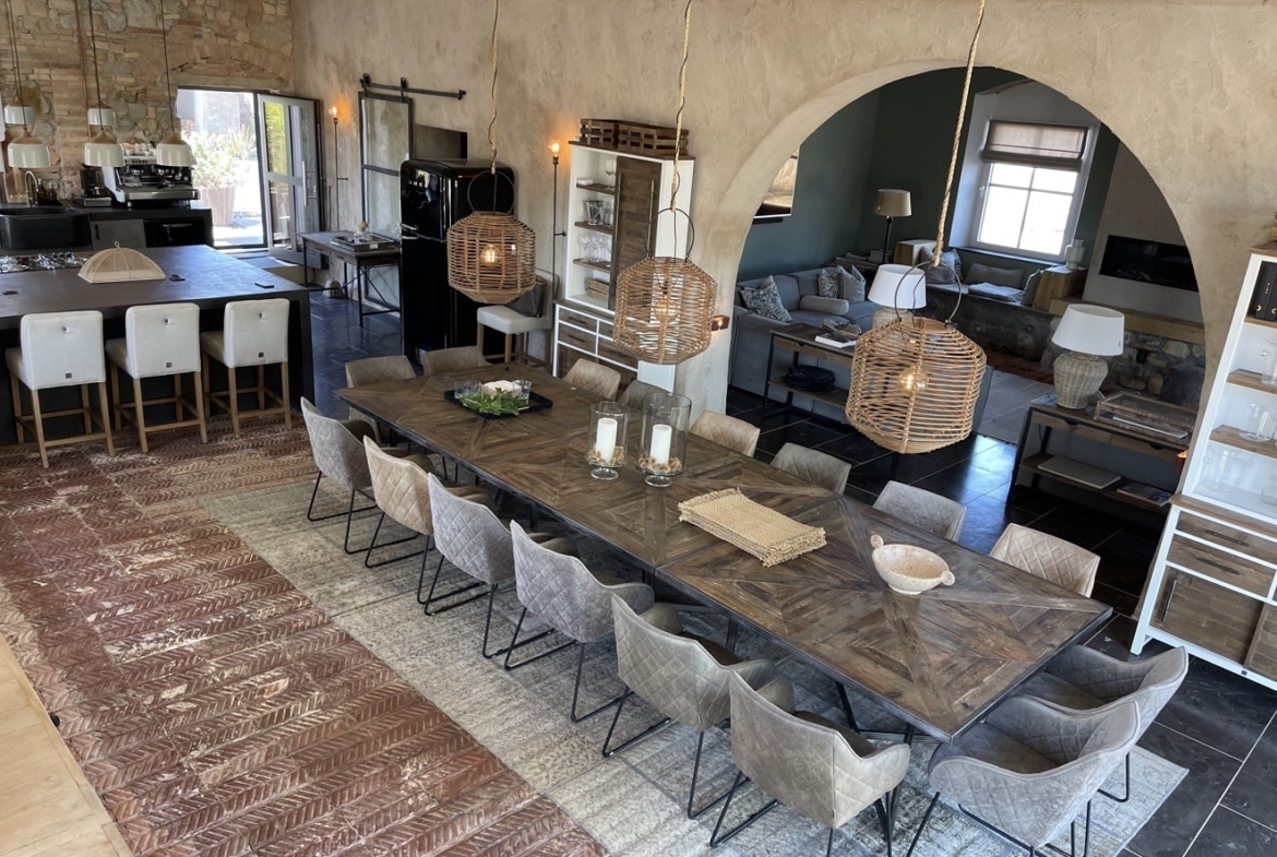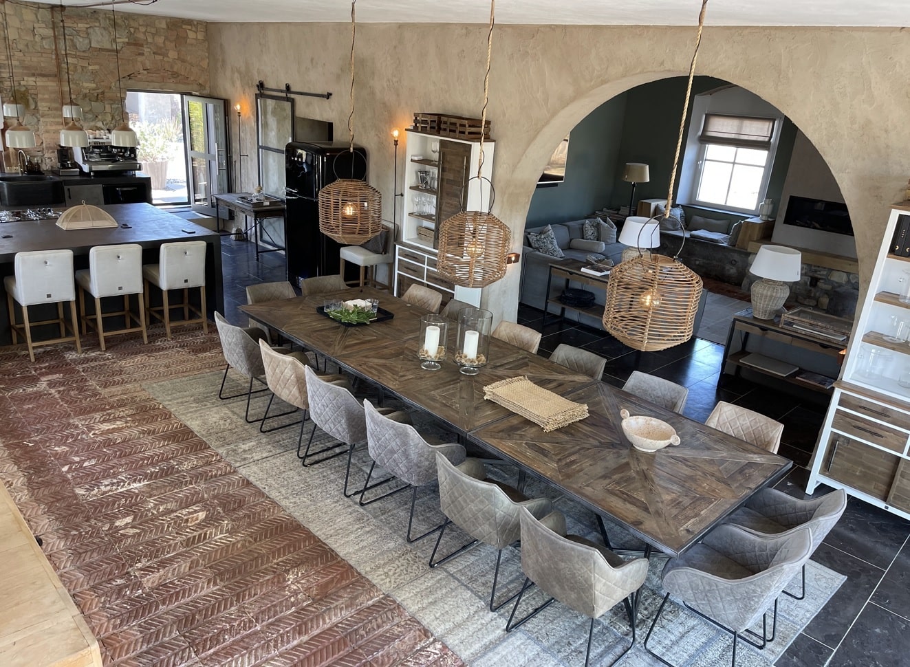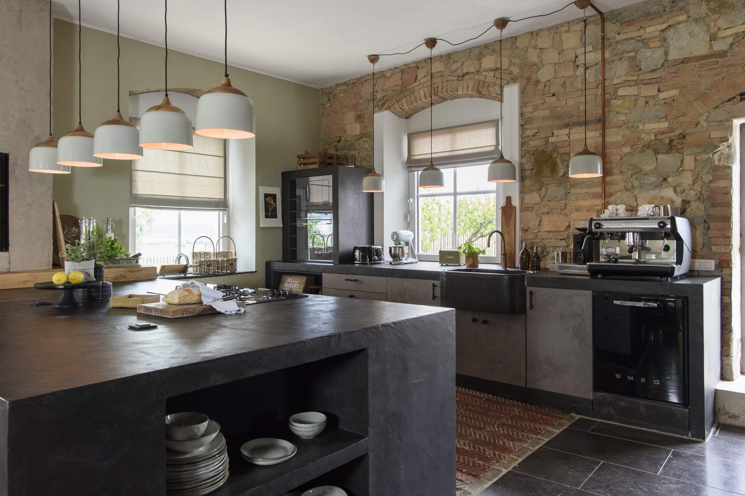 Open-plan kitchen, fully equipped. All appliances are by SMEG: gas burners, oven, dishwasher, etc. It also has a FAEMA coffee machine, earthenware plates and full dishware.